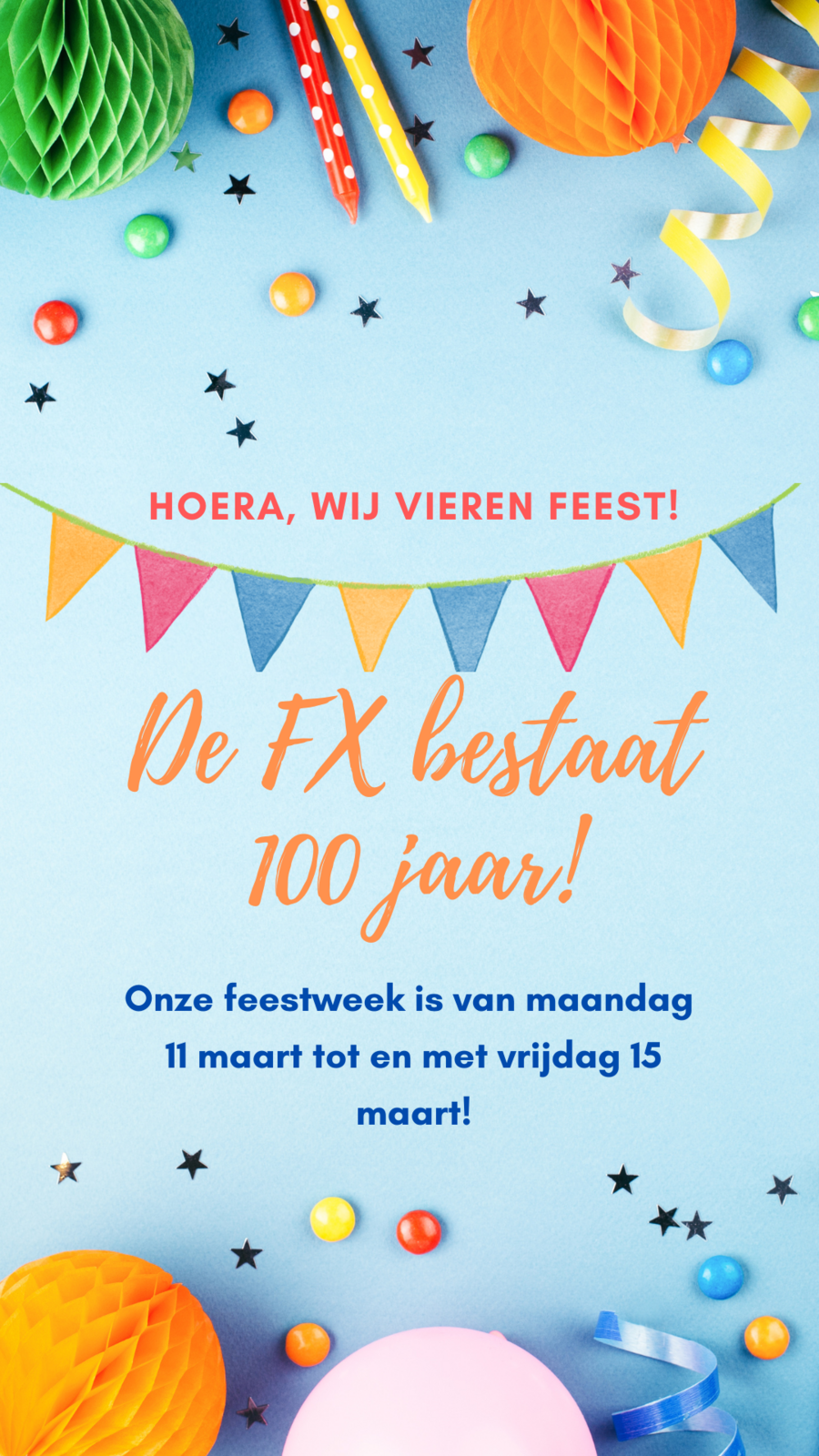 In de week van maandag 11 maart tot en met vrijdag 15 maart hebben wij iedere dag feest! Houd onze 'socials' goed in de gaten om een impressie te krijgen van onze feestelijkheden, want het wordt een groots feestje!
